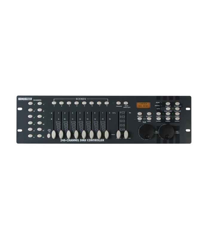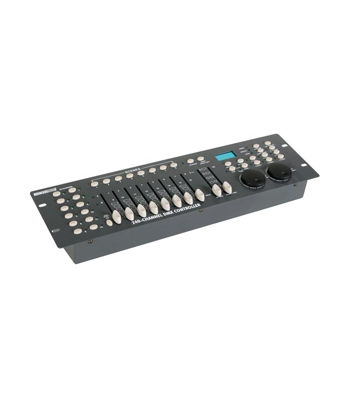 Een 240-kanaals DMX lichtcontroller met jogwheels voor eenvoudig gebruik van pan en tilt.