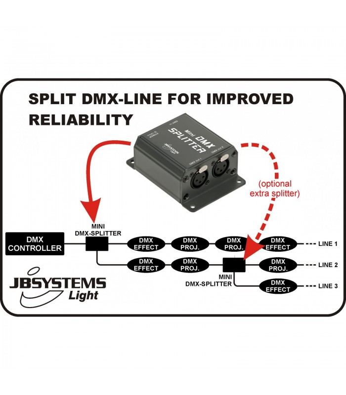 De perfecte oplossing voor vele DMX-problemen: deze mini DMX-splitter splitst om het even welke DMX-lijn in 2 afzonderlijke lijnen die elkaar niet beïnvloeden, problemen op één lijn worden zo gemakkelijk geïsoleerd.