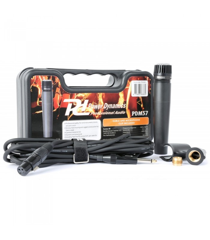 De PDM57 is een professionele cardioid dynamische microfoon, ideaal voor blaasinstrumenten, drums en percussie. Met sterke metalen behuizing en robuuste constructie voor zwaar gebruik.