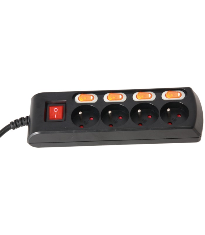 4-voudig verlengsnoer met Franse stopcontacten om toestellen gescheiden aan en uit te schakelen. Ideaal voor kleine lichtinstallaties van mobiele DJ's.