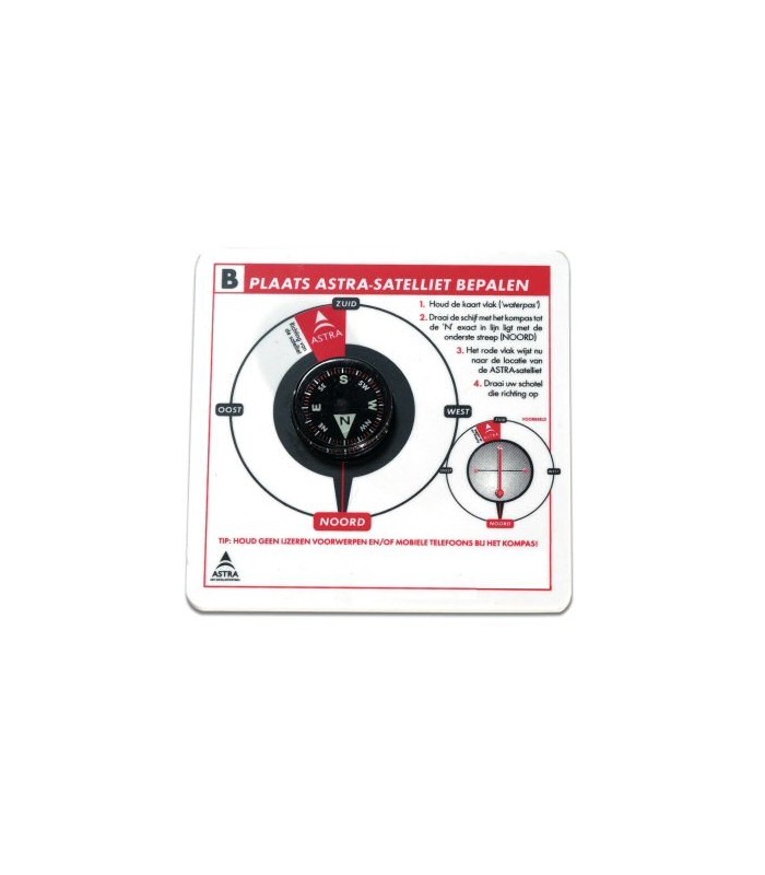 Kompas voor het uitrichten van de schotel, met aanduiding van de Astra satellieten.